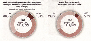 Σε αυτό το πλαίσιο απαισιοδοξίας είναι εντυπωσιακό ότι ο ένας στους δύο πολίτες ( ποσοστό 56% των ερωτηθέντων) δηλώνει ότι θα έφευγε από τη χώρα αν του δινόταν η ευκαιρία.
