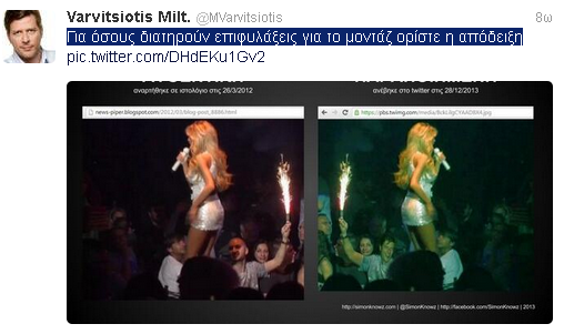 Η παραποιημένη εικόνα απεικόνιζε τον υπουργό, αλλά ο Μιλτιάδης Βαρβιτσιώτης την παρουσίασε σήμερα στο twitter του δίπλα-δίπλα με την πραγματική φωτογραφία από το νυχτερινό κέντρο. Η φωτογραφία συνοδεύτηκε με το σχόλιο «Για όσους διατηρούν επιφυλάξεις για το μοντάζ ορίστε η απόδειξη».