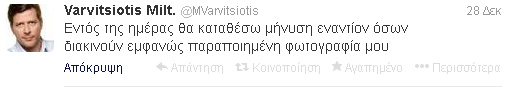 Ο Μιλτιάδης Βαρβιτσιώτης αναφέρθηκε σε συκοφαντικά δημοσιεύματα και μια φωτογραφία που κυκλοφόρησαν στο Διαδίκτυο και τον ήθελαν να τα «σπάει» στα μπουζούκια και να ξοδεύει χιλιάδες ευρώ σε λουλούδια και δήλωσε ότι όσοι αναπαράγουν τη φωτογραφία θα υποστούν τις συνέπειες του νόμου.