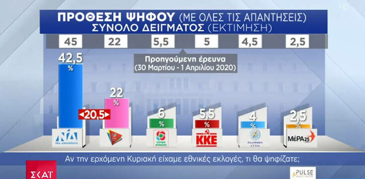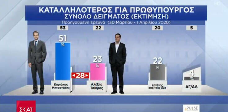 Στη νέα δημοσκόπηση του ΣΚΑΪ και της Pulse αποτυπώνεται η διαφορά της Νέας Δημοκρατίας από τον ΣΥΡΙΖΑ, η οποία φτάνει το 20,5%.