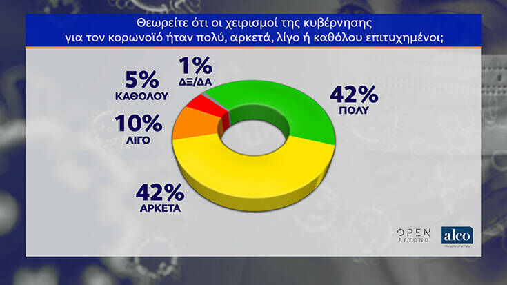 Στην ερώτηση για το πως κρίνονται οι χειρισμοί της κυβέρνησης το 84% τους έκρινε επιτυχημένους, με το 15% να τους θεωρεί λίγο ή καθόλου επιτυχημένους.