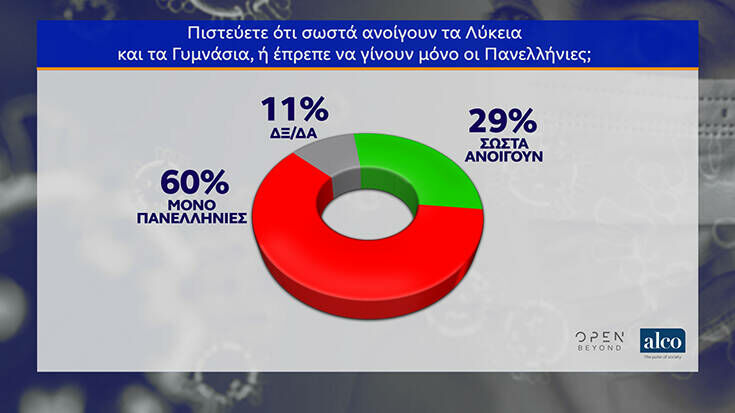 Για το αν ανοίγουν σωστά τα Λύκεια και τα Γυμνάσια ή θα έπρεπε να διεξαχθούν μόνο οι Πανελλήνιες, το 60% θεωρεί ότι έπρεπε να διεξαχθούν μόνο οι Πανελλαδικές οι εξετάσεις, με το 29% να θεωρεί σωστή την απόφαση.