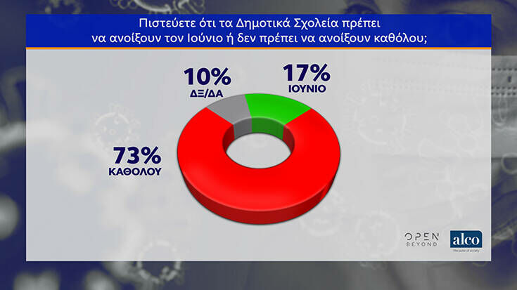 Για τα Δημοτικά σχολεία το 73% θεωρεί ότι δεν πρέπει να ανοίξουν, ενώ το 17% πιστεύει ότι πρέπει να ανοίξουν τον Ιούνιο.