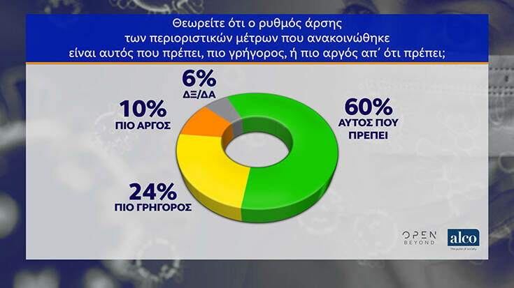 Όσο για τον ρυθμό άρσης των μέτρων το 60% πιστεύει ότι είναι αυτός που πρέπει, το 24% ότι η άρση έγινε πιο γρήγορα και 10% θεωρεί πως η άρση των μέτρων έγινε πιο αργά.