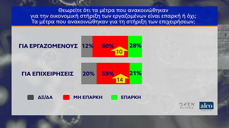 Οι ερωτηθέντες θεωρούν ότι τα οικονομικά μέτρα για τους εργαζόμενους είναι μη επαρκή με ποσοστό 60% και 28% επαρκή. Αντίστοιχα είναι και τα ποσοστά για τις επιχειρήσεις με 59% μη επαρκή και 21% επαρκή.