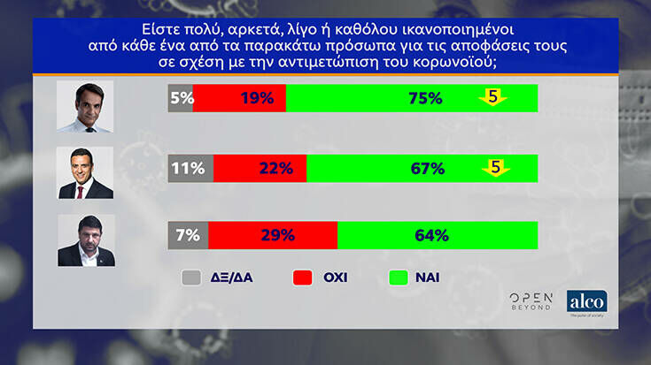 Για τις επιδόσεις του Κυριάκου Μητσοτάκη στην κρίση του κορονοϊού, το 75% είναι ικανοποιημένο από τον πρωθυπουργό έναντι 19%. Η ικανοποίηση για τον Βασίλη Κικίλια φτάνει στο 67% και για τον Νίκο Χαρδαλιά στο 64%.