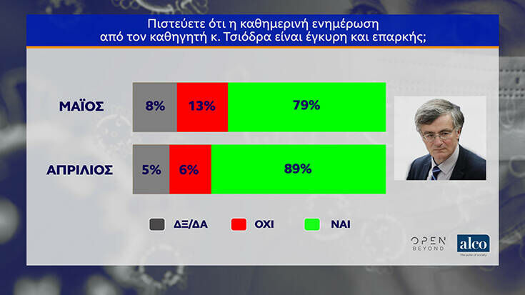 Όσο για την καθημερινή ενημέρωση του κ. Τσιόδρα, το 79% τη θεωρεί επαρκή και το 13% μη επαρκή.