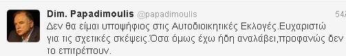 «Δεν θα είμαι υποψήφιος στις Αυτοδιοικητικές Εκλογές. Ευχαριστώ για τις σχετικές σκέψεις.Όσα όμως έχω ήδη αναλάβει,προφανώς δεν το επιτρέπουν» έγραψε χαρακτηριστικά ο κ. Παπαδημούλης.