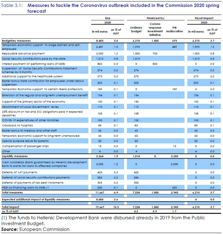 Η ανακοίνωση του υπουργείου Οικονομικών είναι η ακόλουθη: «Για να μην εκτίθεται ο ΣΥΡΙΖΑ στις ανακοινώσεις του, καλό θα ήταν να είχε προηγουμένως διαβάσει τις Εκθέσεις τις οποίες επικαλείται. Στην Έκθεση των Ευρωπαϊκών θεσμών (Enhanced Surveillance Report – May 2020), στη σελίδα 42, τα μέτρα που λαμβάνει η Ελληνική Κυβέρνηση έχουν ποσοτικοποιηθεί σε 19,667 δισ. ευρώ (επισυνάπτεται ο σχετικός πίνακας).