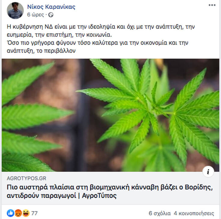 Αναφανδόν υπέρ της καλλιέργειας κάνναβης τάσσεται με ανάρτησή του στο Facebook ο Νίκος Καρανίκας, στενός συνεργάτης του Αλέξη Τσίπρα και πρώην σύμβουλος στρατηγικού σχεδιασμού του πρωθυπουργού επί διακυβέρνησης ΣΥΡΙΖΑ.