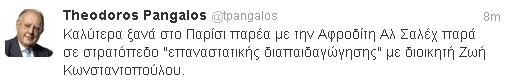 Πριν από λίγο, ο πρώην υπουργός έγραψε στο Twitter: «Καλύτερα ξανά στο Παρίσι παρέα με την Αφροδίτη Αλ Σαλέχ παρά σε στρατόπεδο “επαναστατικής διαπαιδαγώγησης” με διοικητή Ζωή Κωνσταντοπούλου».