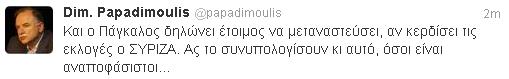 Άμεση ήταν πάντως η απάντηση του κοινοβουλευτικού εκπροσώπου του ΣΥΡΙΖΑ, Δημήτρη Παπαδημούλη, ο οποίος λίγα μόλις λεπτά αργότερα έγραψε: «Και ο Πάγκαλος δηλώνει έτοιμος να μεταναστεύσει, αν κερδίσει τις εκλογές ο ΣΥΡΙΖΑ. Ας το συνυπολογίσουν κι αυτό, όσοι είναι αναποφάσιστοι…»