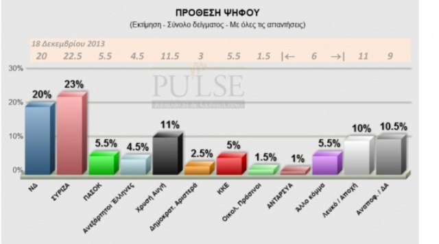 Με αναγωγή επί των έγκυρων, ο ΣΥΡΙΖΑ λαμβάνει 25,5% έναντι 22,5% της Νέας Δημοκρατίας, η Χρυσή Αυγή 12%, το ΠΑΣΟΚ 6%, το ΚΚΕ 5,5%, οι Ανεξάρτητοι Έλληνες 5%, η Δημοκρατική Αριστερά 3%, οι Οικολόγοι Πράσινοι 1,5% και η ΑΝΤΑΡΣΥΑ 1%. Οι αναποφάσιστοι είναι 11,5%.
