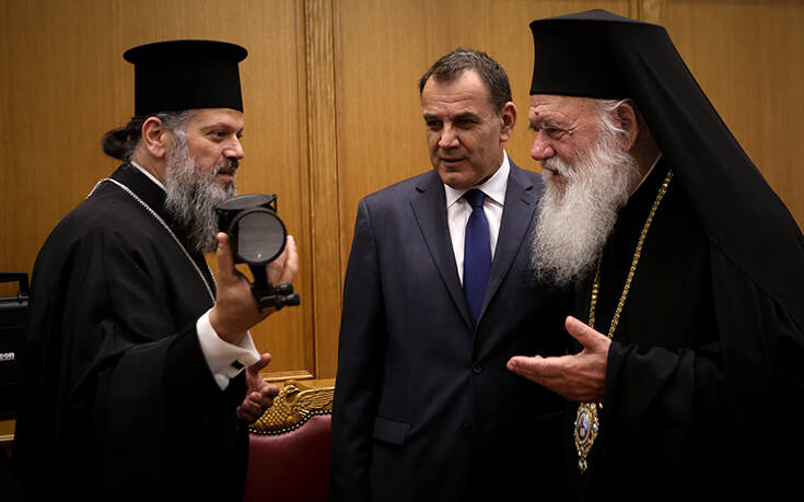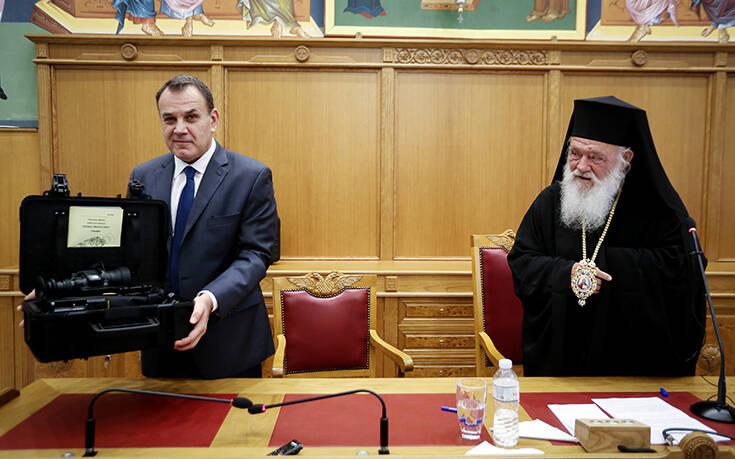 Τον Αρχιεπίσκοπο Αθηνών και πάσης Ελλάδας Ιερώνυμο επισκέφθηκε σήμερα ο υπουργός Εθνικής Άμυνας Νίκος Παναγιωτόπουλος στα γραφεία της Διαρκούς Ιεράς Συνόδου προκειμένου να παραλάβει ειδικό εξοπλισμό για τις δυνάμεις που φυλάσσουν τα σύνορα στον Έβρο και τη θωράκιση του φράκτη στα σύνορα του Έβρου, ύψους 49.000 ευρώ, δωρεά της Διαρκούς Ιεράς Συνόδου της Εκκλησίας της Ελλάδος.