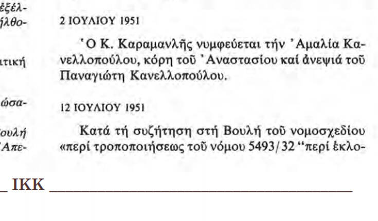 Ειδικότερα, στη σελίδα 141 του πρώτου εκ των 12 τόμων των Αρχείων του Μακεδόνα πολιτικού, διαβάζουμε τα εξής: «2 ΙΟΥΛΙΟΥ 1951: Ο Κ.Καραμανλής νυμφεύεται την Αμαλία Κανελλοπούλου, κόρη του Αναστασίου και ανεψιά του Παναγιώτη Κανελλόπουλου» (σ.σ. το πατρικό της επώνυμο ήταν Κανελλοπούλου, ενώ το Μεγαπάνου προήλθε από τον δεύτερο άνδρα της, μετά το διαζύγιο με τον Καραμανλή, το οποίο και διατήρησε μέχρι τέλους). Μάλιστα στην αμέσως επόμενη σελίδα υπάρχει και σχετική φωτογραφία από τον γάμο, με το ζευγάρι ντυμένο στα λευκά.