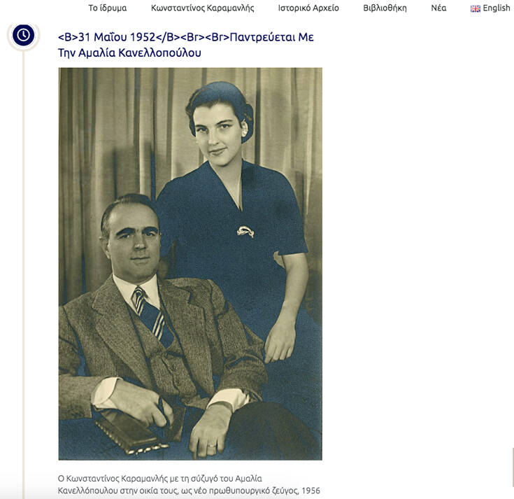 Εάν πάμε στο ηλεκτρονικό χρονολόγιο του ιδρύματος όμως, θα δούμε ότι ο γάμος πραγματοποιήθηκε ένα χρόνο αργότερα. Ειδικότερα, γράφεται χαρακτηριστικά: 31 Μαΐου 1952: Παντρεύεται (σ.σ. ο Καραμανλής) με την Αμαλία Κανελλοπούλου.
