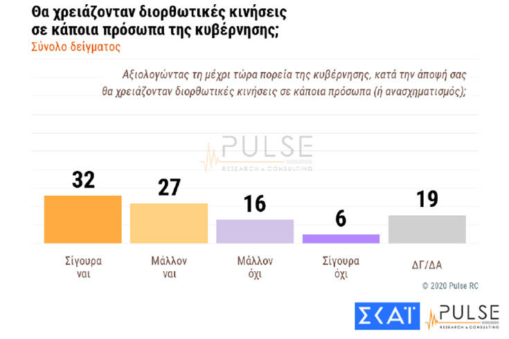 Για το αν χρειάζονται διορθωτικές κινήσεις στα πρόσωπα της κυβέρνησης το 32% απάντησε σίγουρα ναι, το 27% μάλλον ναι, το 16% μάλλον όχι και το 6% σίγουρα όχι. 19% συγκέντρωσε το ΔΓ/ΔΑ.