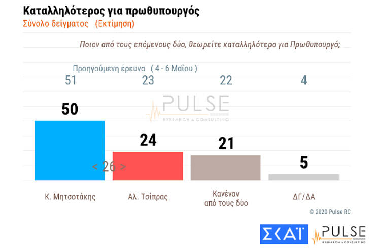 Καταλληλότερος για πρωθυπουργός είναι ο Κυριάκος Μητσοτάκης με 50%, ενώ ο Αλέξης Τσίπρας ακολουθεί στο 24%. Το 21% συγκεντρώνει η απάντηση «κανένας από τους δύο».