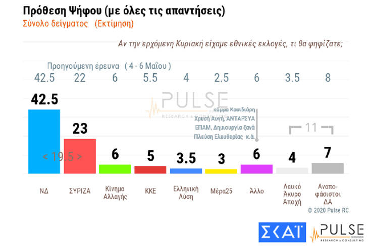 Στην πρόθεση ψήφου η ΝΔ συγκεντρώνει το 42,5%, ο ΣΥΡΙΖΑ 23%, το ΚΙΝΑΛ 6%, το ΚΚΕ 5%, η Ελληνική Λύση το 3,5% και το ΜέΡΑ 25 3%