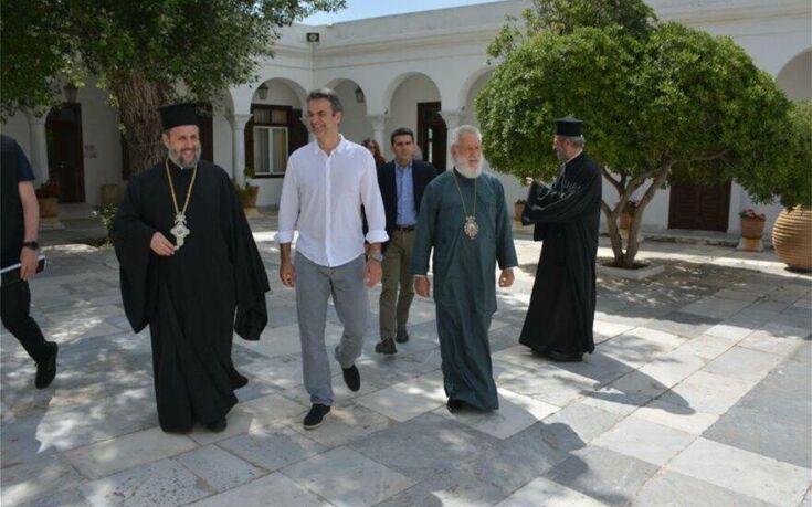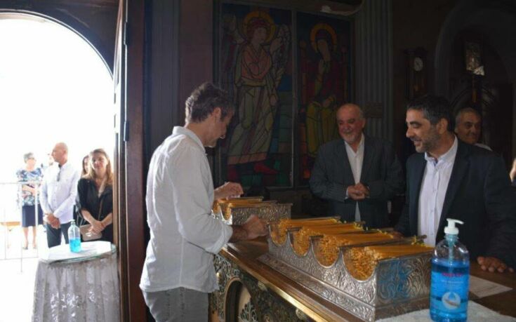 «Σας παρακαλώ κ. Πρόεδρε να προσκυνήσετε την Eικόνα (Αγίων Κωνσταντίνου και Ελένης), την οποία αφιέρωσε στο Ναό της Παναγίας ο πατέρα σας και προσωπικός μου ευεργέτης Κωνσταντίνος Μητσοτάκης» , ανέφερε χαρακτηριστικά ο Μητροπολίτης Σύρου.