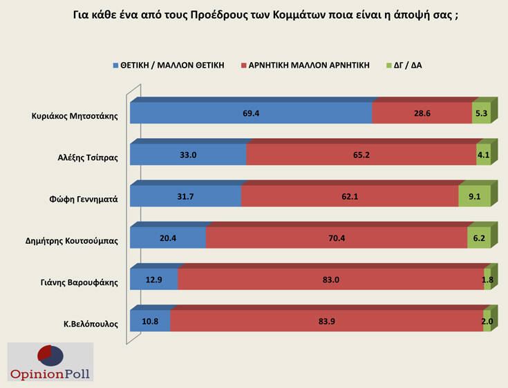 Το 69,4% έχει θετική άποψη για τον σημερινό πρωθυπουργό, ενώ το αντίστοιχο ποσοστό για τον Αλέξη Τσίπρα ανέρχεται σε 33%. Ακολουθεί η Φώφη Γεννηματά με 31,7%, ο Δημήτρης Κουτσούμπας με 20,4%, ο Γιάννης Βαρουφάκης με 12,9% και ο Κυριάκος Βελόπουλος με 10,8%.