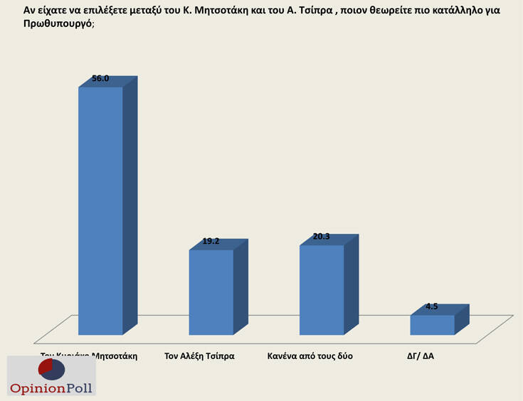 Ο Κυριάκος Μητσοτάκης θεωρείται καταλληλότερος πρωθυπουργός σε ποσοστό 56% έναντι 19,2% του Αλέξη Τσίπρα.