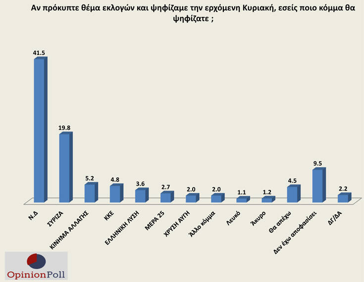 Στην ερώτηση τι θα ψήφιζαν οι πολίτες εάν γίνονταν αύριο εκλογές, η ΝΔ λαμβάνει 41,5% έναντι 19,8% του ΣΥΡΙΖΑ.