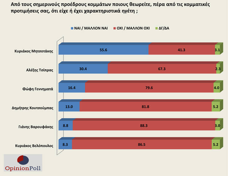 Στην ερώτηση «Από τους σημερινούς προέδρους των κομμάτων ποιους θεωρείτε, πέρα από τις κομματικές προτιμήσεις σας, ότι έχει χαρακτηριστικά ηγέτη» το 55,6% απάντησε «ναι/μάλλον ναι»ο Κυριάκος Μητσοτάκης, το 30,4% ο Αλέξης Τσίπρας και το 16,4% η Φώφη Γεννηματά.