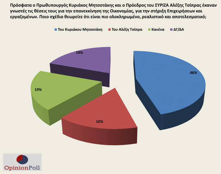 Στην ερώτηση ποιο σχέδιο είναι πιο ρεαλιστικό και ολοκληρωμένο για την επανεκκίνηση της οικονομίας, μετά το lockdown, το 46% απάντησε του Κυριάκου Μητσοτάκη, το 19% είπε «Δεν ξέρω, δεν απαντώ», το 19% «κανένα» και το 16% του Αλέξη Τσίπρα.