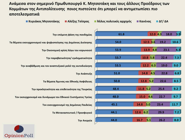 Την επόμενη φάση της πανδημίας, σύμφωνα με τους πολίτες, μπορεί να αντιμετωπίσει πιο αποτελεσματικά ο Κυριάκος Μητσοτάκης σε ποσοστό 61,8% και ο Αλέξης Τσίπρας σε ποσοστό 12%.
