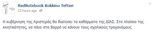 «Η επίσημη ιστοσελίδα του ΣΥΡΙΖΑ “rednotebook.gr” μέσω του λογαριασμού της στο Facebook επί λέξει αναφέρει: “Η κυβέρνηση της Αριστεράς θα διαλύσει τα καθάρματα της ΔΙΑΣ”. Εκτός από τις ύβρεις και τη στοχοποίηση το rednotebook.gr συνεχίζοντας, απειλεί τους αστυνομικούς ανοιχτά με διώξεις τύπου βόρειας Κορέας αναφέροντας (επίσης επί λέξει) ότι: “Στο πλαίσιο της κινητικότητας, να πάνε στο Βορρά να κάνουν τους σχολικούς τροχονόμους”», αναφέρεται χαρακτηριστικά στην ανακοίνωση της ΝΔ.