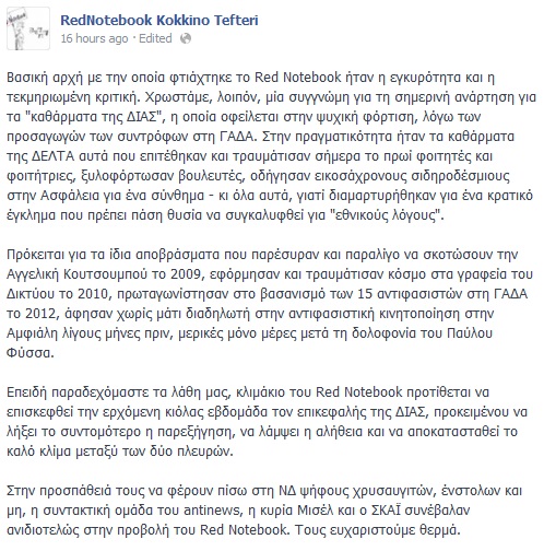 Άμεση ήταν η απάντηση της ιστοσελίδας. Αφού ζήτησε «συγνώμη» για την φράση «καθάρματα της ΔΙΑΣ», αποδίδοντας σε «ψυχική φόρτιση» τον χαρακτηρισμό, έκανε λόγο για «καθάρματα της ΔΕΛΤΑ» και «αποβράσματα». «Βασική αρχή με την οποία φτιάχτηκε το Red Notebook ήταν η εγκυρότητα και η τεκμηριωμένη κριτική. Χρωστάμε, λοιπόν, μία συγγνώμη για τη σημερινή ανάρτηση για τα “καθάρματα της ΔΙΑΣ”, η οποία οφείλεται στην ψυχική φόρτιση, λόγω των προσαγωγών των συντρόφων στη ΓΑΔΑ. Στην πραγματικότητα ήταν τα καθάρματα της ΔΕΛΤΑ αυτά που επιτέθηκαν και τραυμάτισαν σήμερα το πρωί φοιτητές και φοιτήτριες, ξυλοφόρτωσαν βουλευτές, οδήγησαν εικοσάχρονους σιδηροδέσμιους στην Ασφάλεια για ένα σύνθημα – κι όλα αυτά, γιατί διαμαρτυρήθηκαν για ένα κρατικό έγκλημα που πρέπει πάση θυσία να συγκαλυφθεί για “εθνικούς λόγους”», ανέφερε σε σημερινή ανάρτηση στο Facebook.