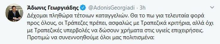 «Δέχομαι πληθώρα τέτοιων καταγγελιών. Θα το πω για τελευταία φορά προς όλους, οι Τράπεζες πρέπει, ασφαλώς με Τραπεζικά κριτήρια, αλλά όχι με Τραπεζικές υπερβολές να δώσουν χρήματα στις υγιείς επιχειρήσεις. Προτιμώ να συνεννοηθούμε όλοι μας πολιτισμένα» έγραψε στο Twitter.
