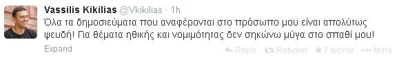 Λίγο νωρίτερα, είχε γράψει στο Twitter: «Όλα τα δημοσιεύματα που αναφέρονται στο πρόσωπο μου είναι απολύτως ψευδή! Για θέματα ηθικής και νομιμότητας δεν σηκώνω μύγα στο σπαθί μου!»