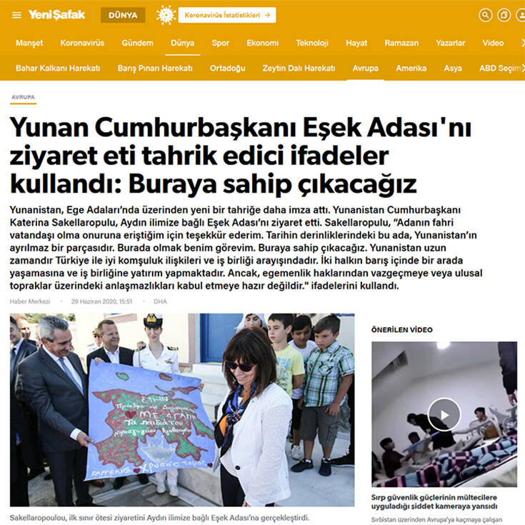 Το yenisafak.com έχει ως τίτλο: «Η Πρόεδρος της Ελλάδας επισκέφτηκε το Αγαθονήσι και χρησιμοποίησε προκλητικές εκφράσεις: “Θα το προστατεύσουμε”».