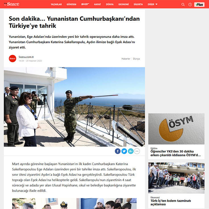 Το sozcu.com αναφέρει πως «Η Πρόεδρος της Ελλάδας στην Τουρκία» και συνεχίζει: «Η Σακελλαροπούλου έφτασε στο Αγαθονήσι, που είναι τουρκικό έδαφος, με ελικόπτερο».