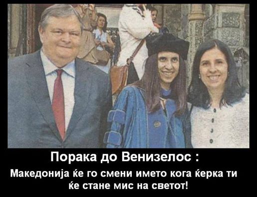Ενδεικτική του αρνητικού κλίματος που καλλιεργείται στα Σκόπια για την επικείμενη επίσκεψη Βενιζέλου, είναι ανάρτηση του γενικού γραμματέα της Γραμματείας Ευρωπαϊκών Υποθέσεων της χώρας, Γιόβαν Αντόνοφσκι, στον λογαριασμό του στο Facebook. Στην ανάρτηση αναφέρει: «Μήνυμα για το Βενιζέλο: Η “Μακεδονία” θα αλλάξει το όνομά της, όταν η κόρη σου γίνει Μις Κόσμος!», ενώ συνοδεύεται από φωτογραφία που δημοσιεύεται στον ιστότοπο «NovaTV».