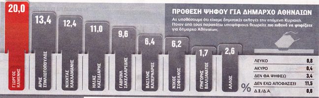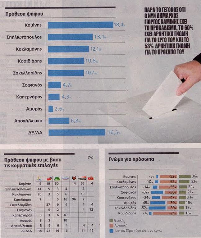 Οι δημοσκοπήσεις που πραγματοποιήθηκαν από την ALCO για την εφημερίδα Πρώτο Θέμα και από την Mrb για την Realnews, δίνουν πρώτο και με ποσοστά 18,4% και 20% αντίστοιχα στον Γ. Καμίνη.