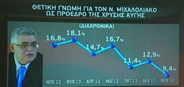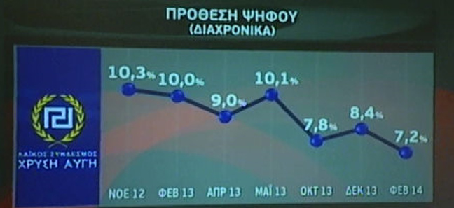 Πάντως, σύμφωνα με τα αποτελέσματα των μετρήσεων, η Χρυσή Αυγή δημοσκοπικά έχει παρουσιάσει σημαντική πτώση, από το 10,3% το Νοέμβριο του 2012 στο 7,2% τον τρέχοντα μήνα.