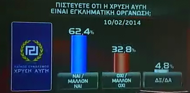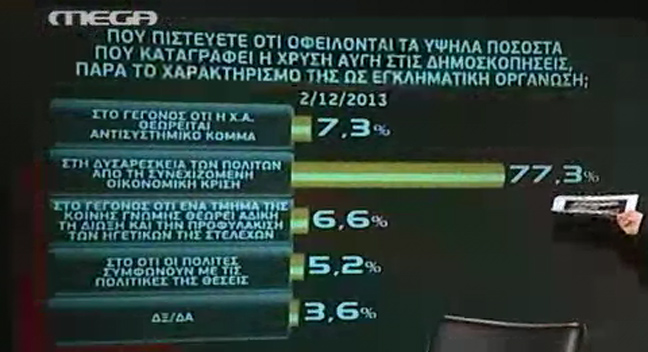 Στο ερώτημα «πού πιστεύετε ότι οφείλονται τα υψηλά ποσοστά που καταγράφει η Χρυσή Αυγή στις Δημοσκοπήσεις, παρά το χαρακτηρισμό της ως εγκληματική οργάνωση;», η συντριπτική πλειοψηφία (77,3%) απαντά «στη δυσαρέσκεια των πολιτών από τη συνεχιζόμενη οικονομική κρίση».