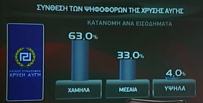 Από τα αποτελέσματα της δημοσκόπηση προκύπτει ότι σε ποσοστό 63% οι ψηφοφόροι της Χρυσής Αυγής είναι χαμηλού εισοδήματος, ενώ το 67% είναι άνδρες.