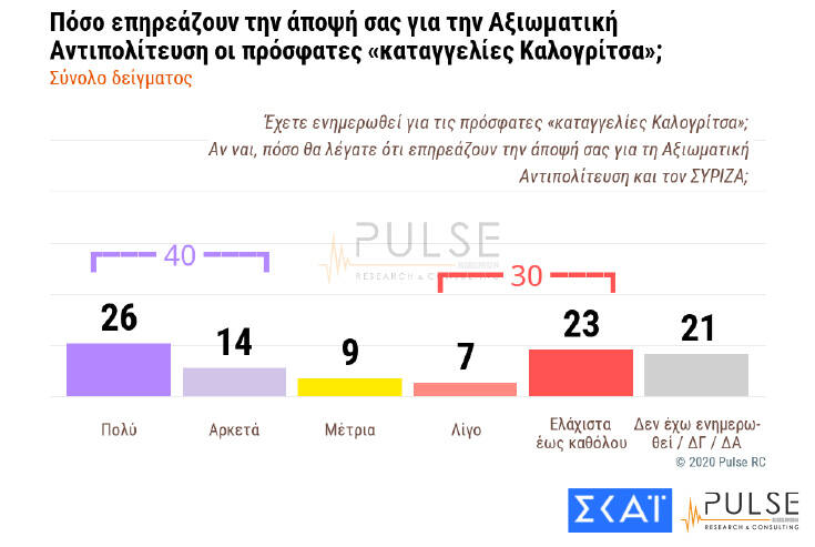 Πιο συγκεκριμένα, το 40% των ερωτηθέντων απαντά ότι οι πρόσφατες καταγγελίες Καλογρίτσα έχουν επηρεάσει πολύ ή αρκετά την άποψή τους για την αξιωματική αντιπολίτευση, έναντι 30% που απαντά ότι επηρεάστηκε ελάχιστα ή καθόλου. Το 21% των ερωτηθέντων απάντησε πως δεν έχει ενημερωθεί για την υπόθεση.