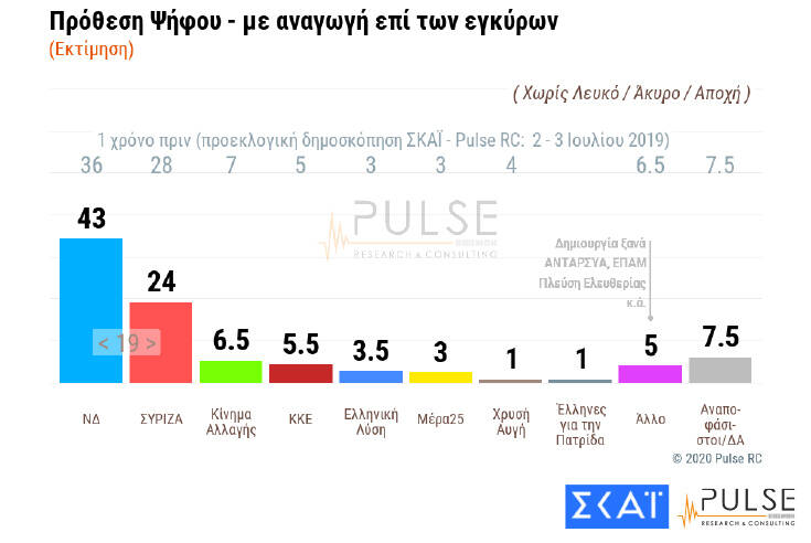 Νέα δημοσκόπηση της Pulse για τον ΣΚΑΪ με τη διαφορά της Νέας Δημοκρατίας με τον ΣΥΡΙΖΑ να βρίσκεται στις 18 μονάδες.