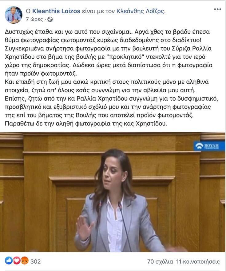 Επίσης, ζητώ από την κα Ραλλία Χρηστίδου συγγνώμη για το δυσφημιστικό, προσβλητικό και εξυβριστικό σχόλιό μου και την ανάρτηση φωτογραφίας της επί του βήματος της Βουλής που αποτελεί προϊόν φωτομοντάζ. Παραθέτω δε την αληθή φωτογραφία της κας Χρηστίδου».