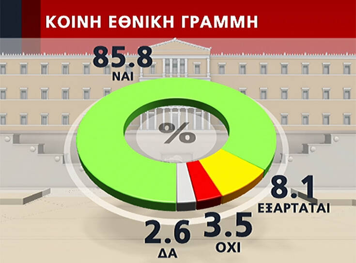 Σε ερώτηση που δέχθηκαν οι πολίτες αν τα κόμματα της αντιπολίτευσης πρέπει να στηρίξουν την κυβέρνηση απέναντι στα εθνικά θέματα; Το 85,8% απάντησε θετικά, ναι να στηριχτεί η Κυβέρνηση, το 8,1% απάντησε εξαρτάται και το 3,5 % απάντησε αρνητικά.