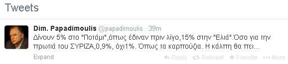 «Δίνουν 5% στο «Ποτάμι», όπως έδιναν πριν λίγο 15% στην «Ελιά»» σχολιάζει με μήνυμα του στο Twitter ο κοινοβουλευτικός εκπρόσωπος του ΣΥΡΙΖΑ Δημήτρης Παπαδημούλης με αφορμή τη δημοσκόπηση που βγάζει τέταρτη δύναμη το κόμμα του Σταύρου Θεοδωράκη εν όψει των ευρωεκλογών.