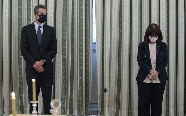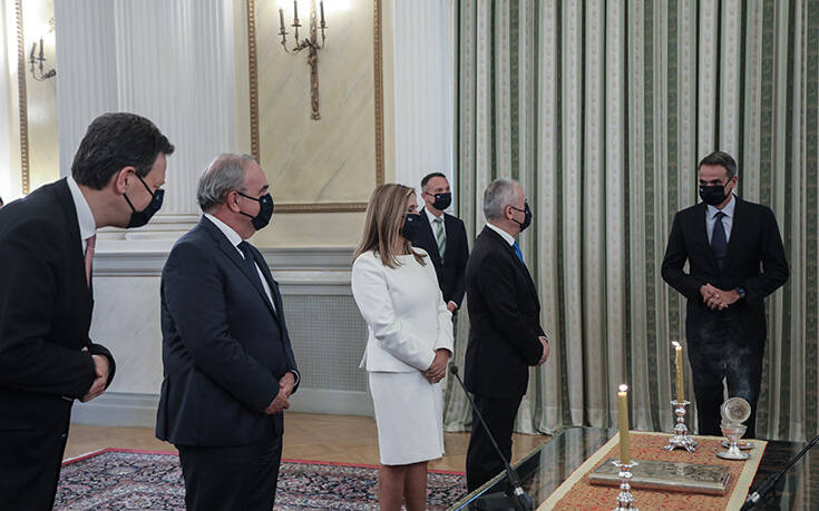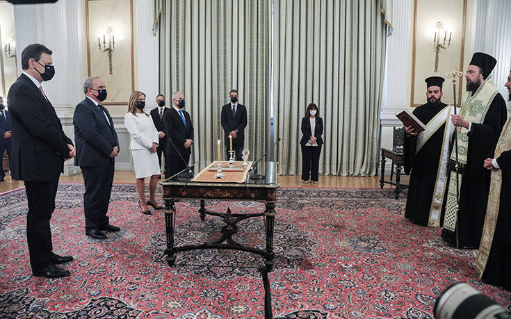 Άπαντες με μάσκες στο πρόσωπο ελέω κορονοϊού παρέστησαν σήμερα στο Προεδρικό Μέγαρο που πραγματοποιήθηκε η ορκωμοσία των νέων μελών της κυβέρνησης. Από την Πρόεδρο της Δημοκρατίας Κατερίνα Σακελλαροπούλου και τον πρωθυπουργό Κυριάκο Μητσοτάκη μέχρι τον σερβιτόρο που κέρασε ακολούθως τις πορτοκαλάδες ήταν όλοι μασκοφορεμένοι. Εξαίρεση αποτέλεσαν μονάχα τα μέλη της Ιεράς Συνόδου της Εκκλησίας της Ελλάδας.
