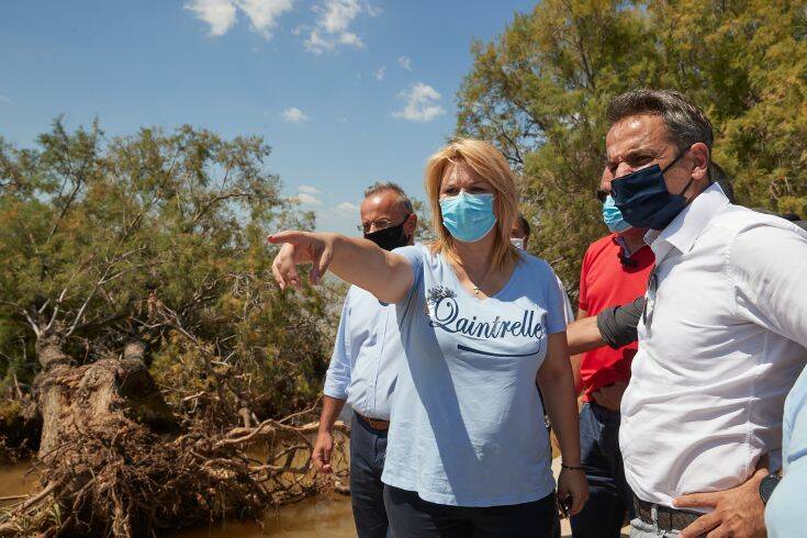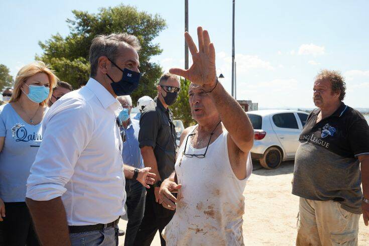 Ο Κυριάκος Μητσοτάκης πραγματοποίησε αρχικά εναέρια αυτοψία των πληγεισών περιοχών με ελικόπτερο της Πυροσβεστικής, συνοδευόμενος από τον Υπουργό Εσωτερικών Τάκη Θεοδωρικάκο, τον Υφυπουργό Προστασίας του Πολίτη Νίκο Χαρδαλιά, τον Γενικό Γραμματέα Πολιτικής Προστασίας Βασίλη Παπαγεωργίου και τον Γενικό Γραμματέα Υποδομών, Γιώργο Καραγιάννη.