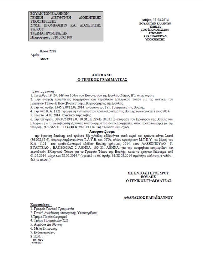 Όπως αναφέρει η σχετική απόφαση, αποφασίστηκε η «έγκριση δαπάνης από τριάντα έξι χιλιάδες εβδομήντα οκτώ ευρώ και τριάντα πέντε λεπτά (36.078,35 €), συμπεριλαμβανομένου Τ.Α.Υ.Β. και ΦΠΑ, πλέον κρατήσεων Μ.Τ.Π.Υ., σε βάρος του Κ.Α. 1121 του προϋπολογισμού εξόδων Βουλής χρήσεως 2014, στον ΑΛΕΞΟΠΟΥΛΟ Γ. ΕΥΑΓΓΕΛΟ , ΒΑΣ.ΣΟΦΙΑΣ 2 ΑΘΗΝΑ, 100 21, ΑΘΗΝΑ, για την προμήθεια εφημερίδων και περιοδικών Ελληνικού Τύπου για το Γραφείο Τύπου της Βουλής, κατά το χρονικό διάστημα από 01.02.2014 μέχρι και 28.02.2014 * (σχετικό το υπ’ αριθμ. 31/28.02.2014 τιμολόγιο πώλησης αγαθών δελτίο αποστ.)».
