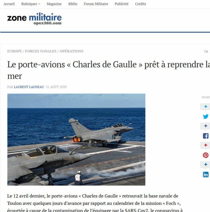 Η Γαλλίδα υπουργός Άμυνας Φλορένς Παρλί έχει δηλώσει πως, μετά την απολύμανση που έγινε, λόγω κρουσμάτων κορονοϊού στο πλοίο, το Charles de Gaulle θα είναι έτοιμο σήμερα 1η Σεπτεμβρίου να αποπλεύσει για την επόμενη αποστολή του.